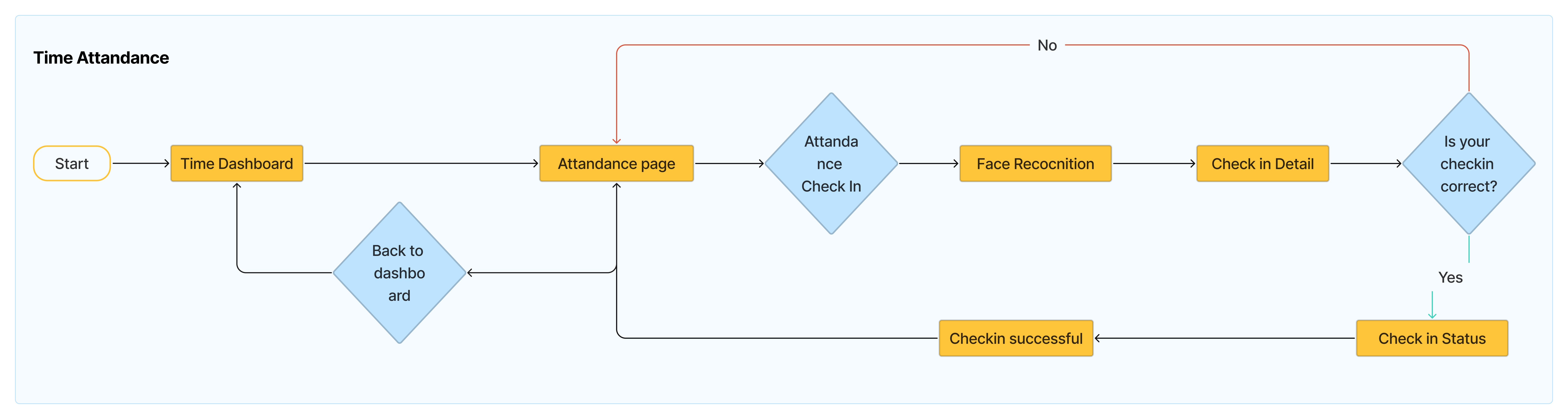 Time attandence menu, user checks in - performs face recognition - checkin detail page - submit, the checkin time attandance process is complete (You,re Tap Today).