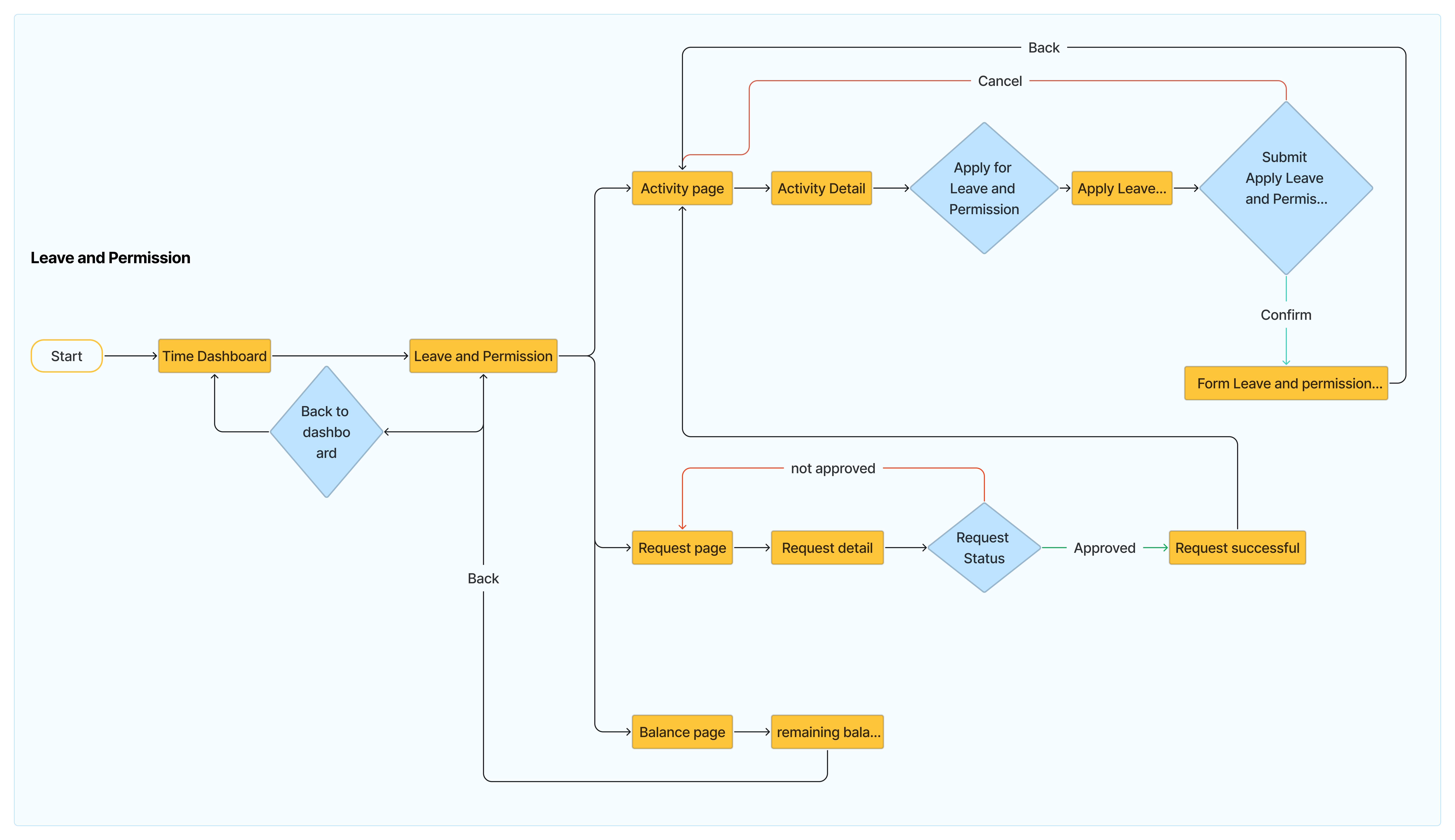 On the WLB App Time Dashboard there are several sub menus including Checkin Attandance, Schedule, Leave and Permit, Overtime and Calendar. The following is the Chart Flow from several sub menus of the Time WLB App features as shown in the image below: